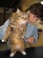 In de huid scheren, oververhitting doordat een dier zich te druk maakt, brandwonden door een te hete scheerkop, ingegroeide nagels... ik weet nu precies wat te doen als dit soort dingen gebeuren. EHBO voor dieren op de trimtafel was een zeer interessante cursus! En ik heb een hoop dingen geleerd waarvan ik niet had verwacht dat ze op de trimtafel voor kunnen komen, en wat ik ook niet hoop!! Wat denk je van een hond die het snoer van de tondeuse kapot bijt en een schok krijgt? Gelukkig heb ik een draadloze tondeuse. Of een hond die aan een riempje vast zit op de trimtafel en ervan af valt met de lijn nog om zijn kop, waardoor zijn oog uit de kas wordt geperst... Ik ben blij dat ik katten niet vast zet!